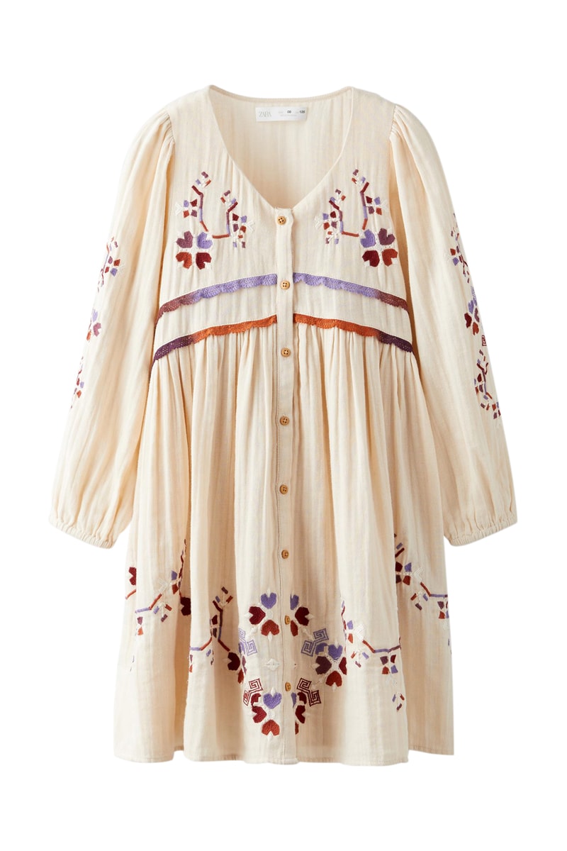 Geborduurd bloemmotief op de mouwen, aan de voorkant en op de rok.