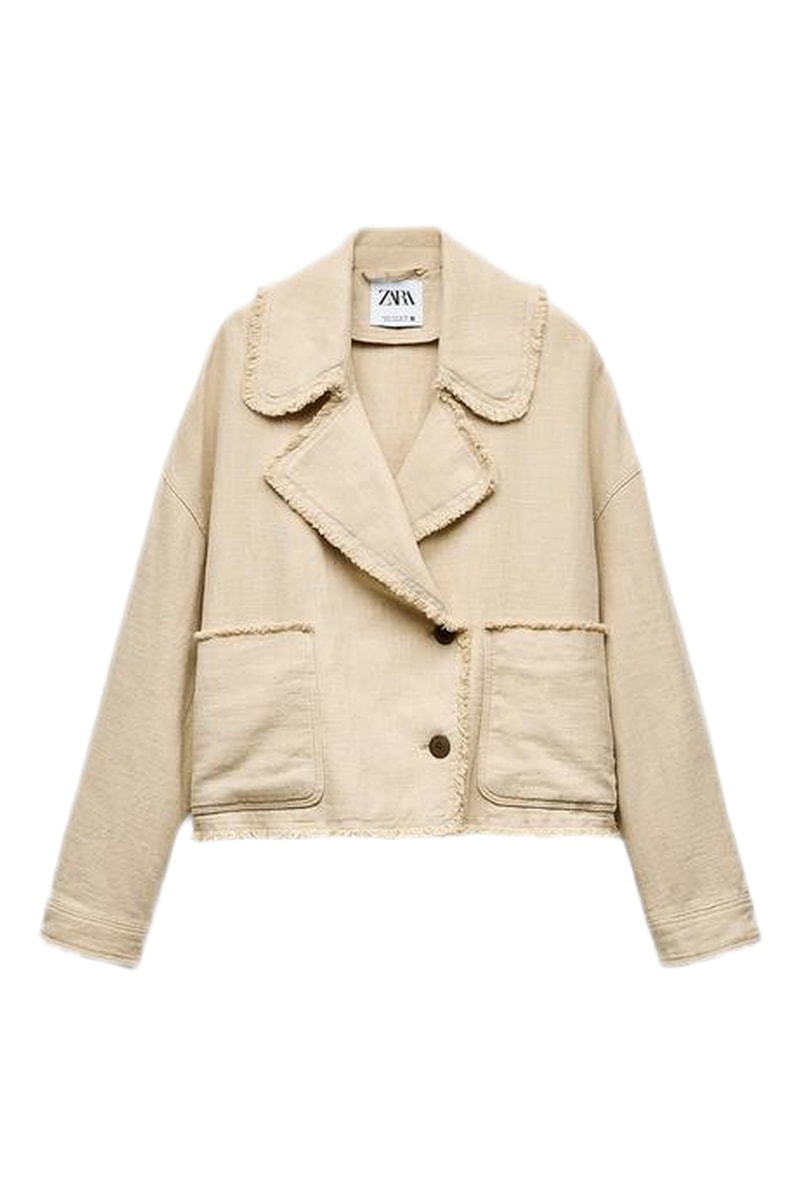 Geribde boorden bij de hals, op de zakken en aan de voorkant.
