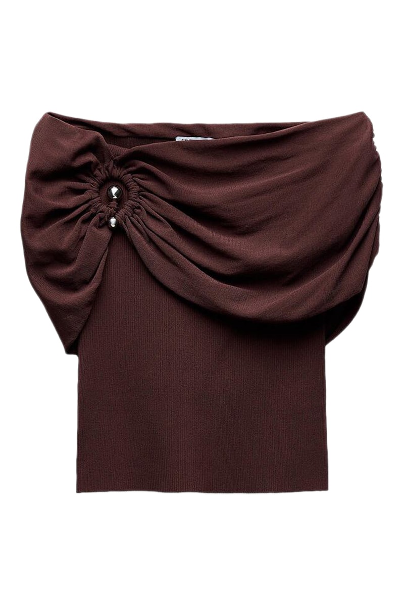 Uitsnijding en metalen detail en plooien aan de voorkant.