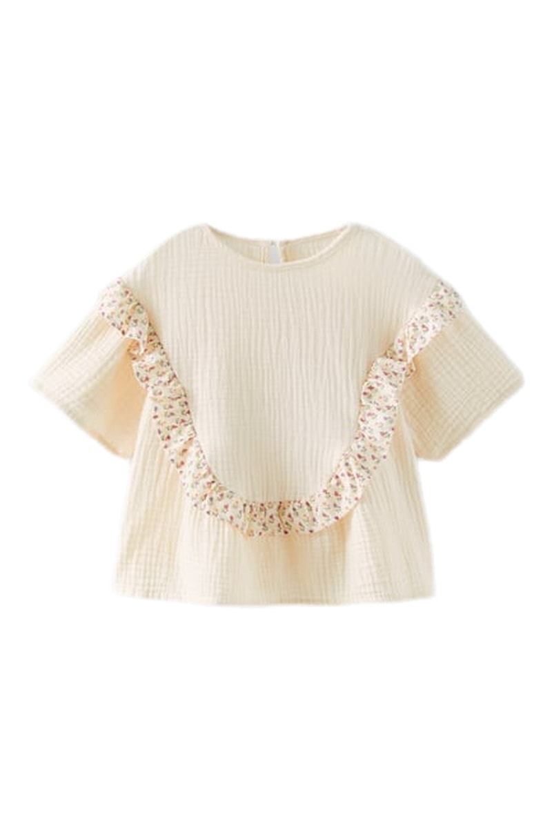 Ruches met decoratief motief op de mouwen en aan de voorkant.
