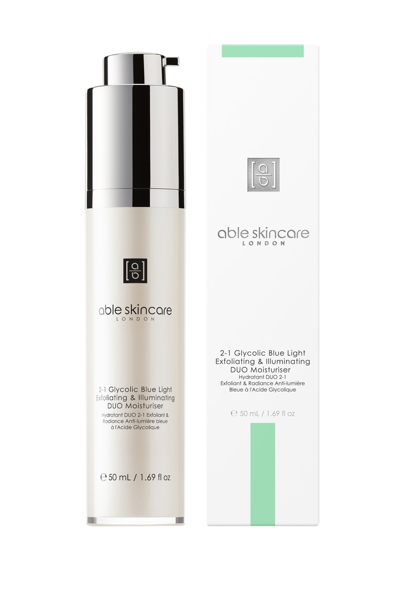 Hydraterende 2-in-1 scrub en beschermer tegen blauw licht met glycolzuur.