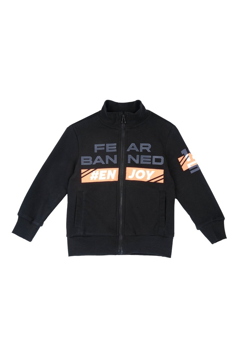 Sweater met lange mouwen. Opstaande kraag. 2 zakken. Belettering aan de voorkant. Ritssluiting.
