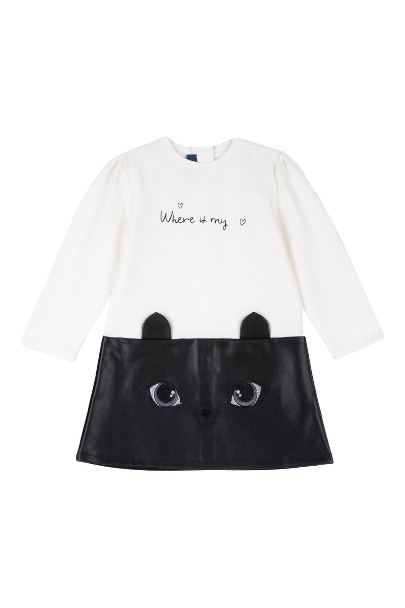Trompe-l'oeil jurk met lange mouwen.