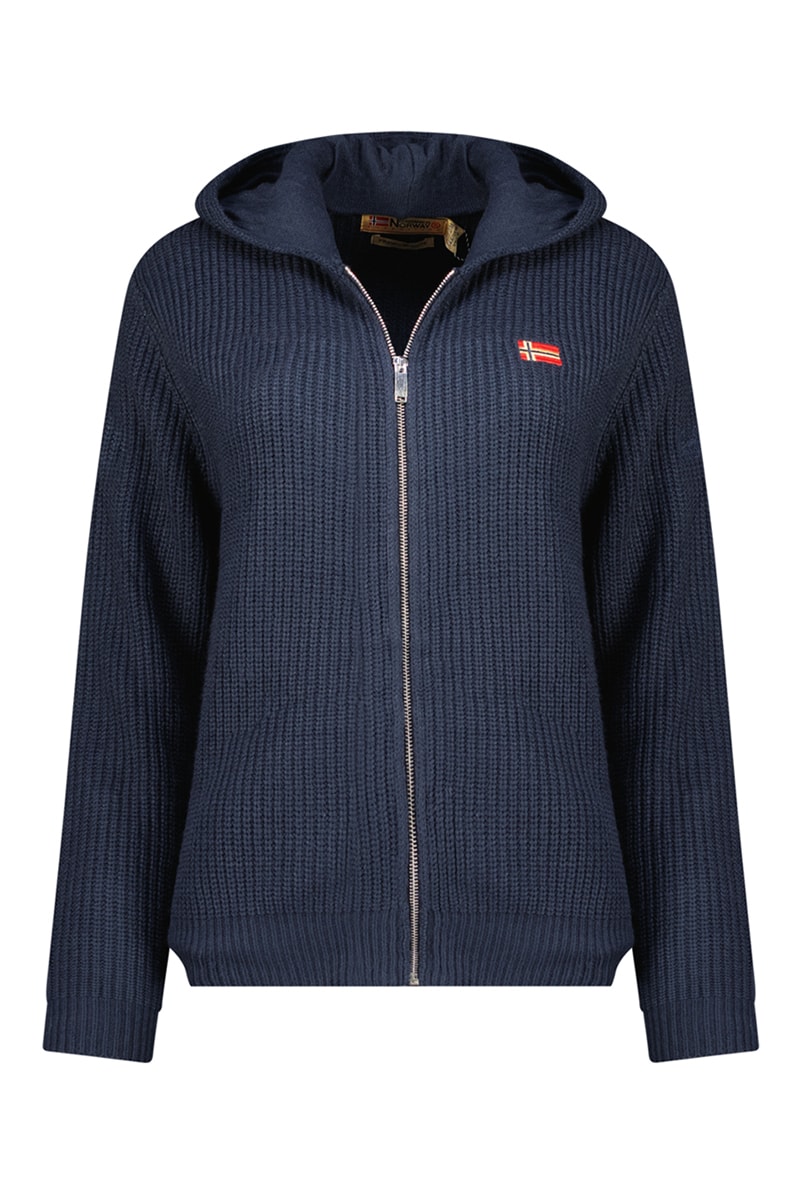 Vest met capuchon. Lange mouwen waarvan 1 met decoratief motief.