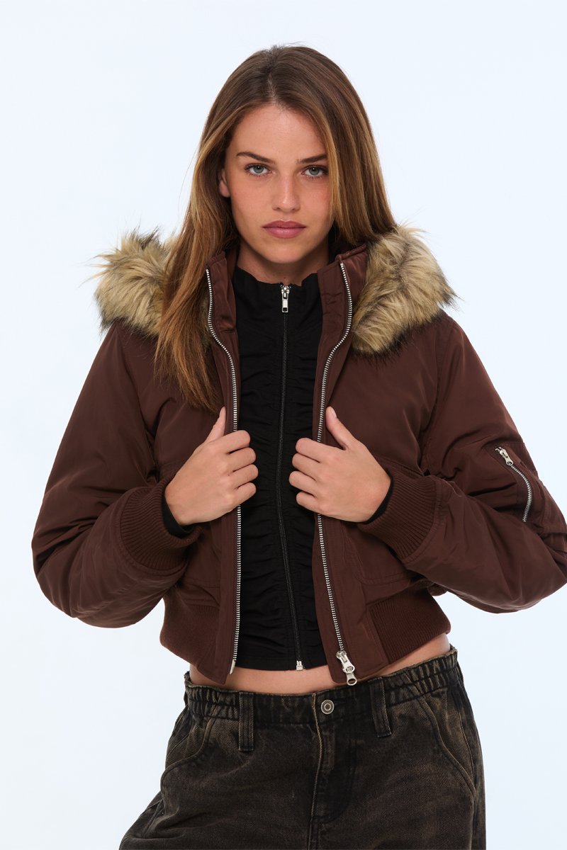 Gewatteerde jas met capuchon en imitatiebont.