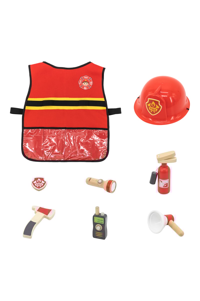 Bevat een helm, een brandweervest, een brandblusser, een walkie-talkie, een badge, een zaklamp en een toeter.