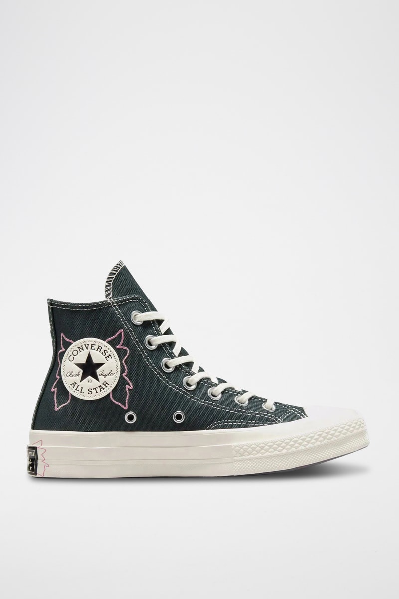 Geborduurd decoratief motief, detail van kunstleer en decoratieve oogjes aan de zijkanten.