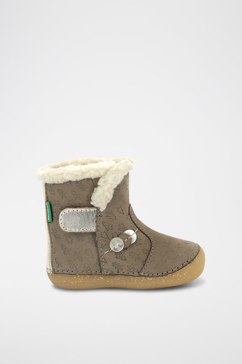 Gevoerde laarsjes van metallic leer en nubuck met decoratief motief in reliëf.