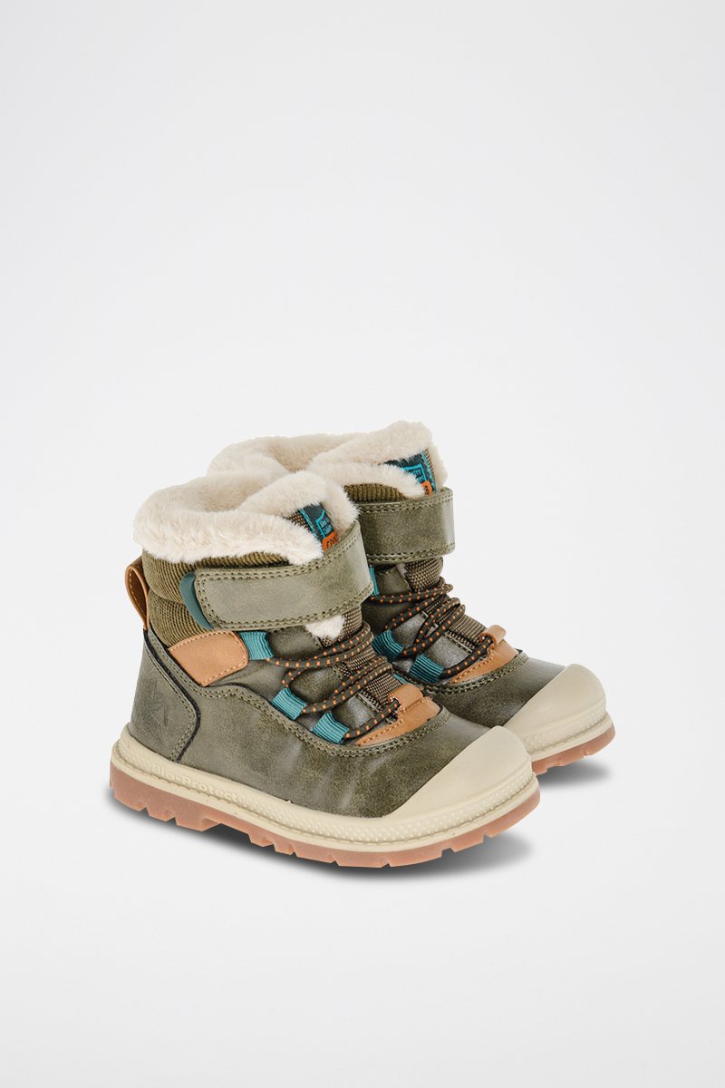 Veter- en klittenbandsluiting aan de voorkant, rits aan de zijkant.