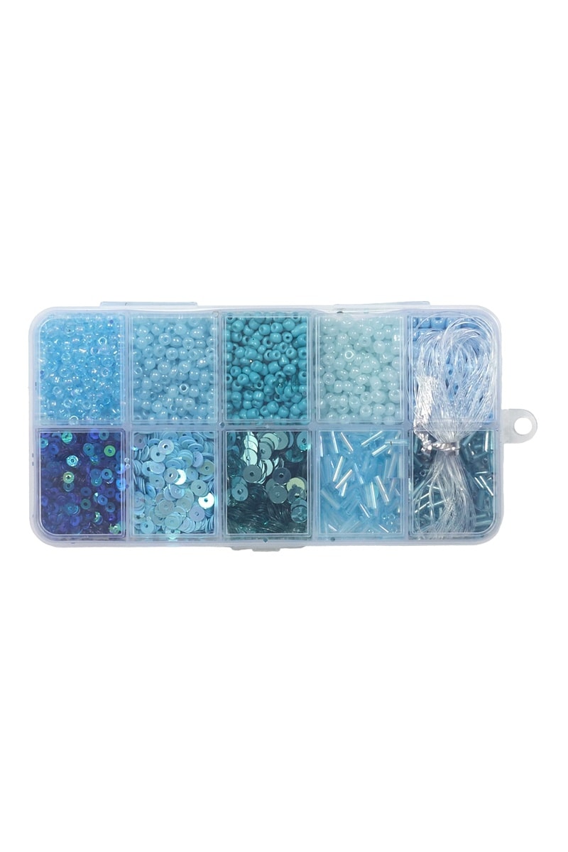 Meerdere compartimenten met parels van verschillende kleuren en vormen.