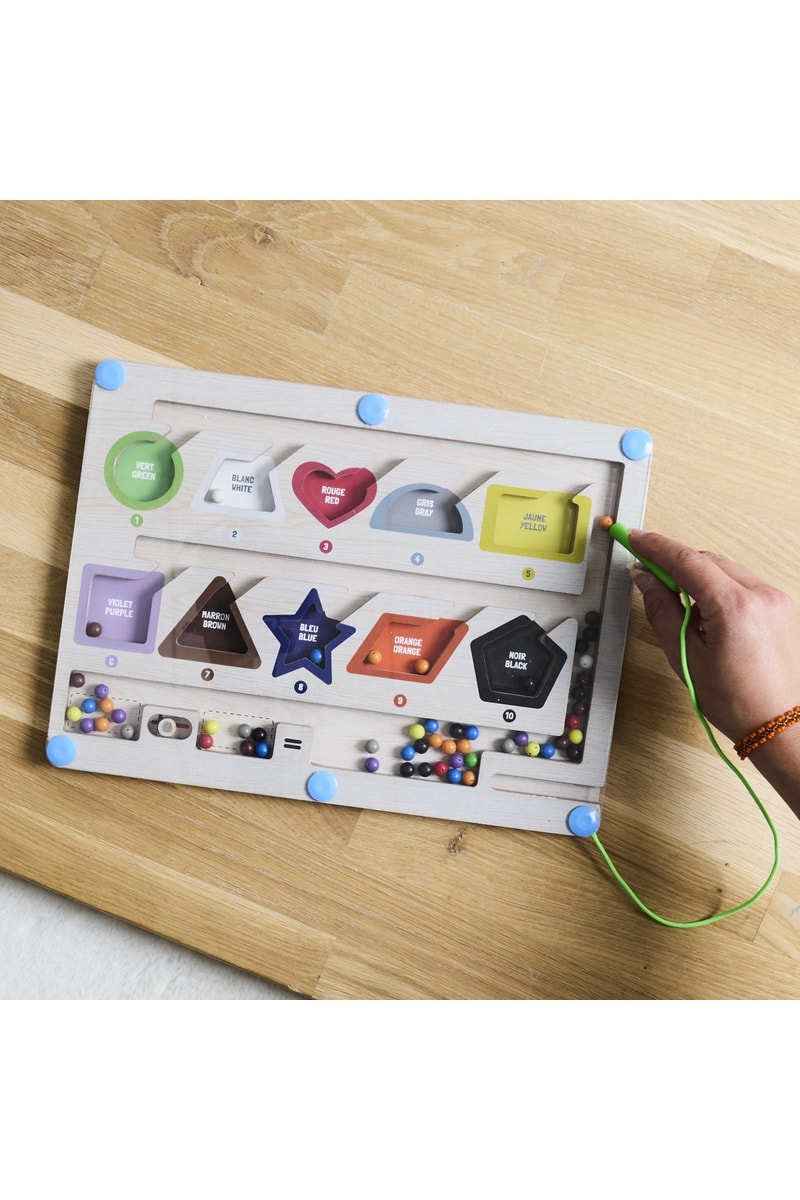 Spelregels: met behulp van de magnetische pen verplaatst het kind de gekleurde balletjes in het labyrinth en zo de kleuren te sorteren.