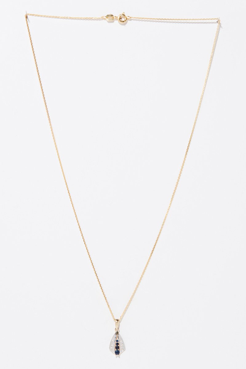 Materiaal: geelgoud 375/1000, diamanten 0,043 karaat/10 en saffier 0,268 karaat/4