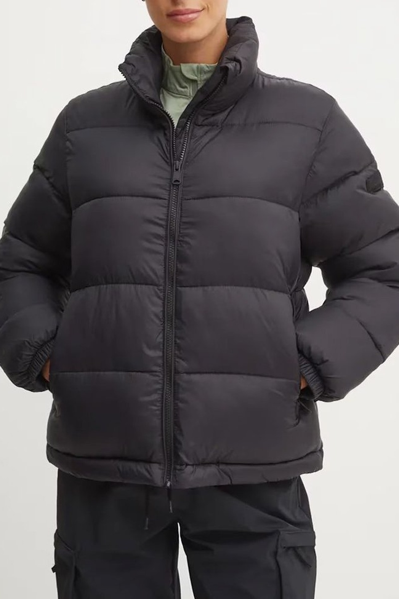 Gewatteerde jas met lange elastische mouwen waarvan 1 met geborduurd logo.