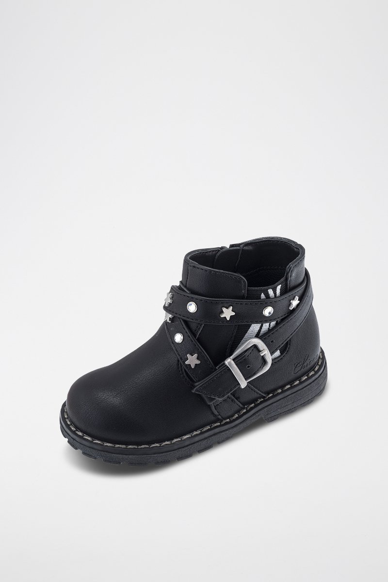 Gespsluitingen en ritssluiting aan de zijkanten.