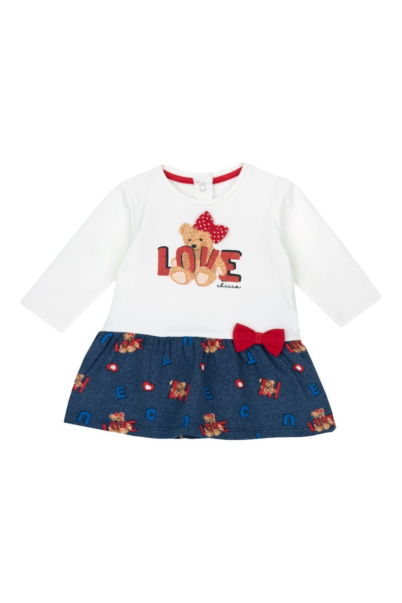 Belettering en pluchemotief aan de voorkant en op de rok.