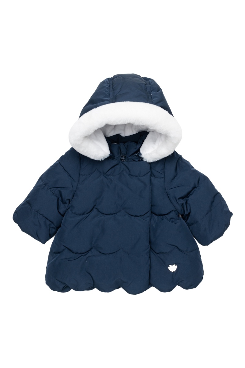 Gewatteerde jas met afneembare capuchon en imitatiebont.