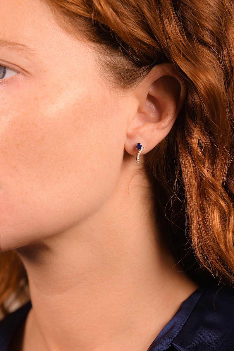 Oorbellen van witgoud ingelegd met 9 diamanten en 1 saffier.