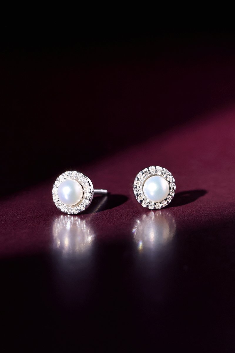 Oorbellen van witgoud ingelegd met 16 diamanten en 1 cultivéparel.