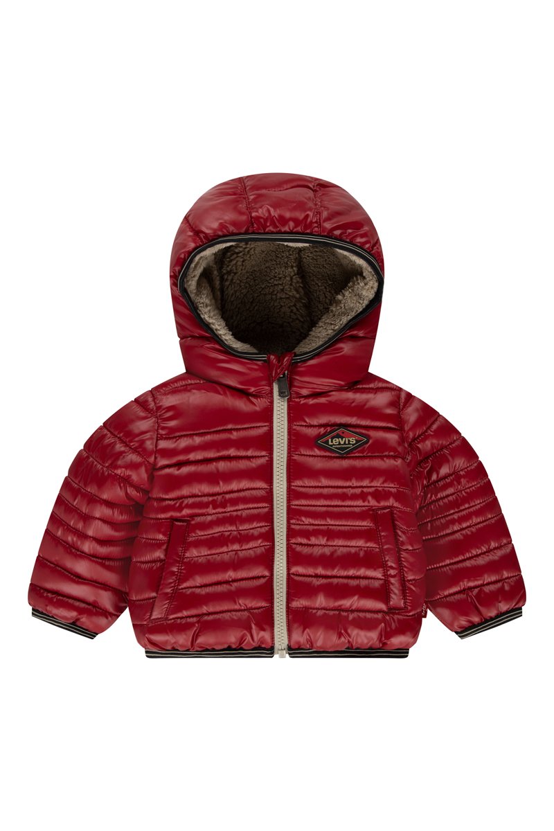 Streepmotief op de capuchon, op de mouwen en aan de onderkant.
