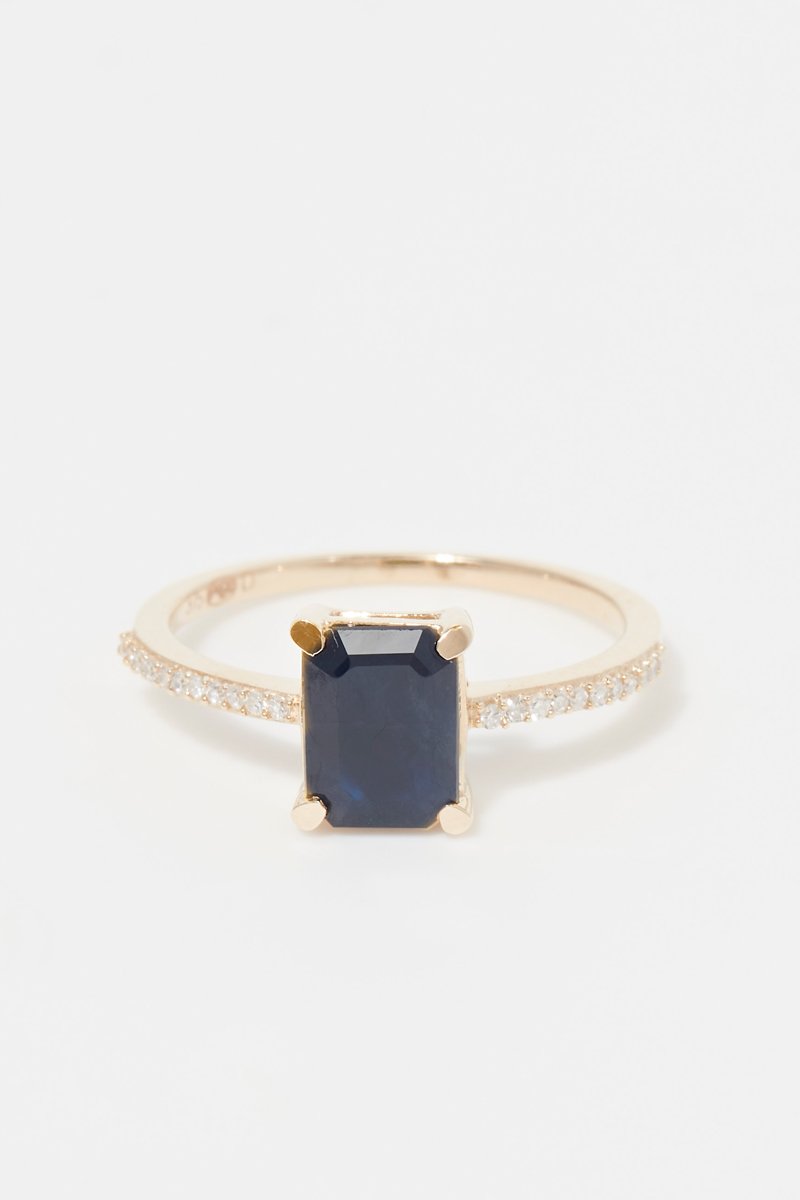 Materiaal: geelgoud 375/1000, diamanten 0,09 karaat/22 en saffier 2,02 karaat/1