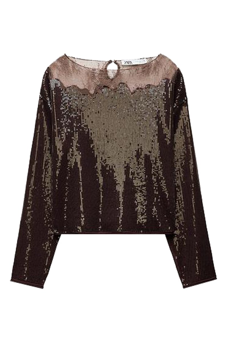 Top van 2 materialen met pailletten.