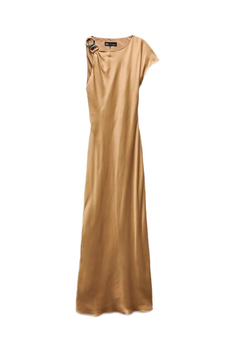Korte mouw aan de linkerkant en bandje met metallic ringen aan de rechterkant.