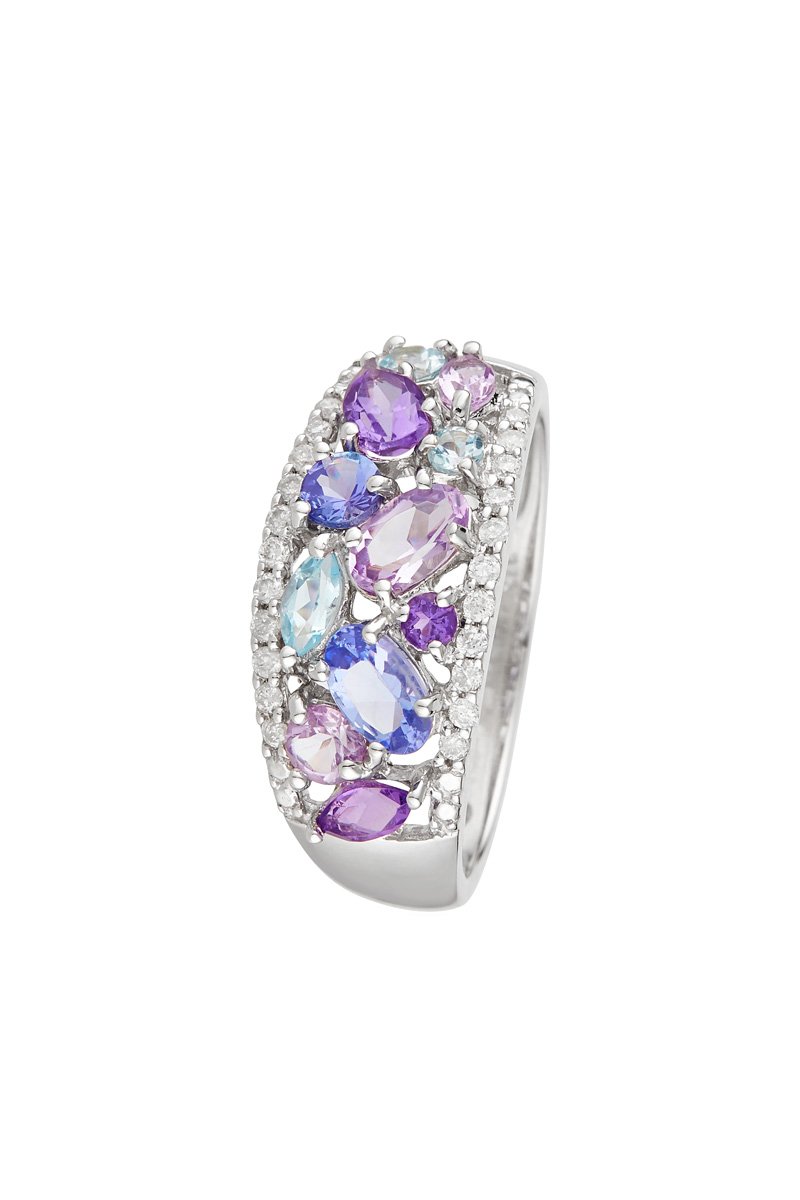 Ring van witgoud ingelegd met 22 diamanten, 6 amethisten, 2 tanzanieten en 3 topazen.