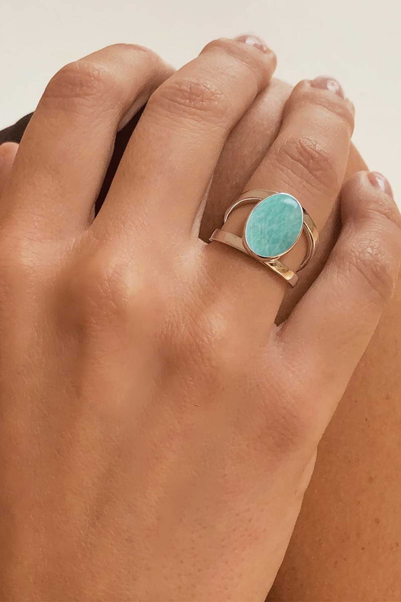 Ring van zilverkleurig brons ingelegd met 1 amazoniet.