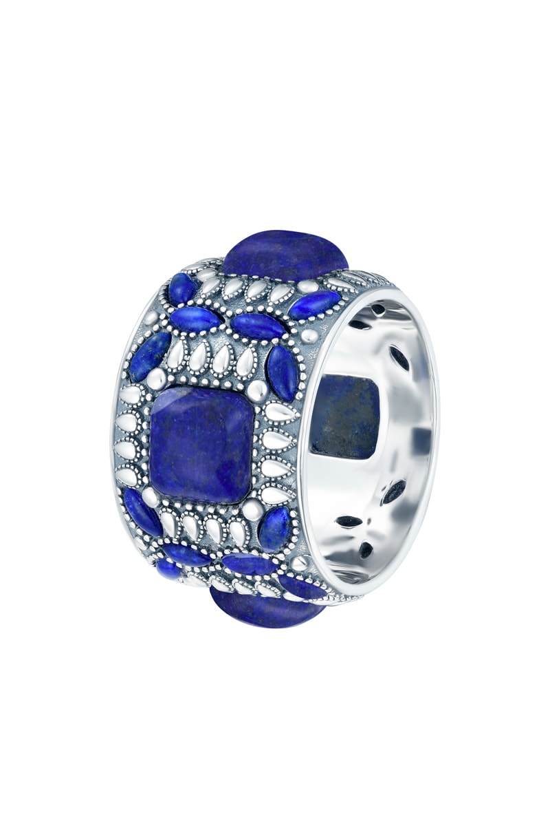 Ring van zilverkleurig brons ingelegd met lapis lazuli.