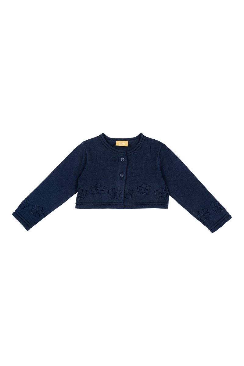 Opengewerkt bloemmotief op de mouwen en aan de voorkant.