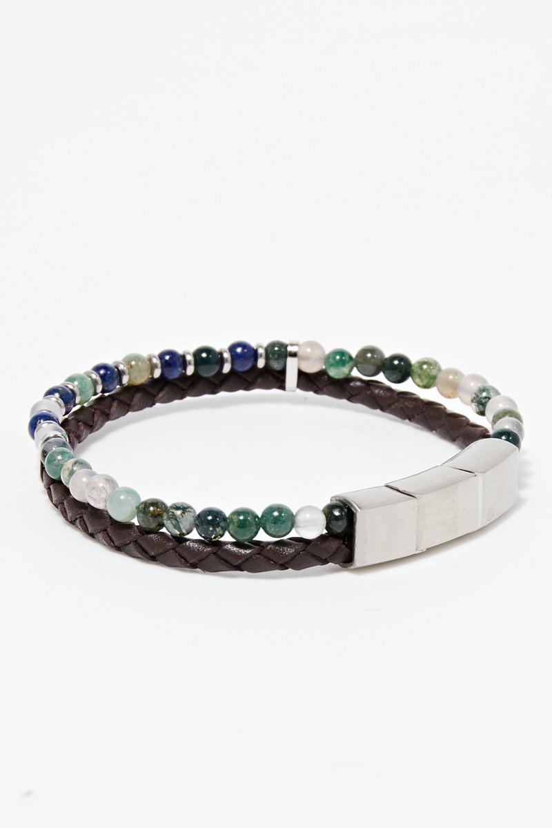 Dubbele armband van gevlochten leer ingelegd met siersteentjes.