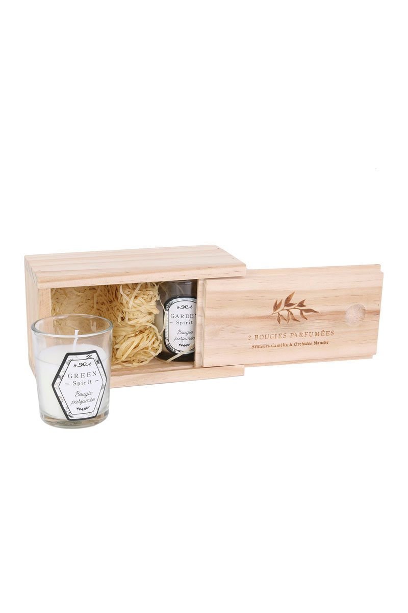 2 Kaarsen en Houten Kist - Witte Orchidee en Lentebloem