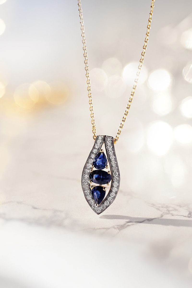 Materiaal: geelgoud 375/1000, diamanten 0,16 karaat/31 en saffieren 0,85 karaat/3