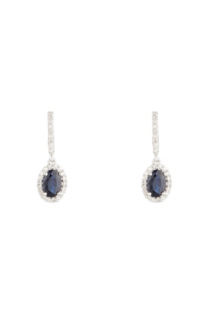 Hangende oorbellen van witgoud ingelegd met 25 diamanten en 1 saffier.