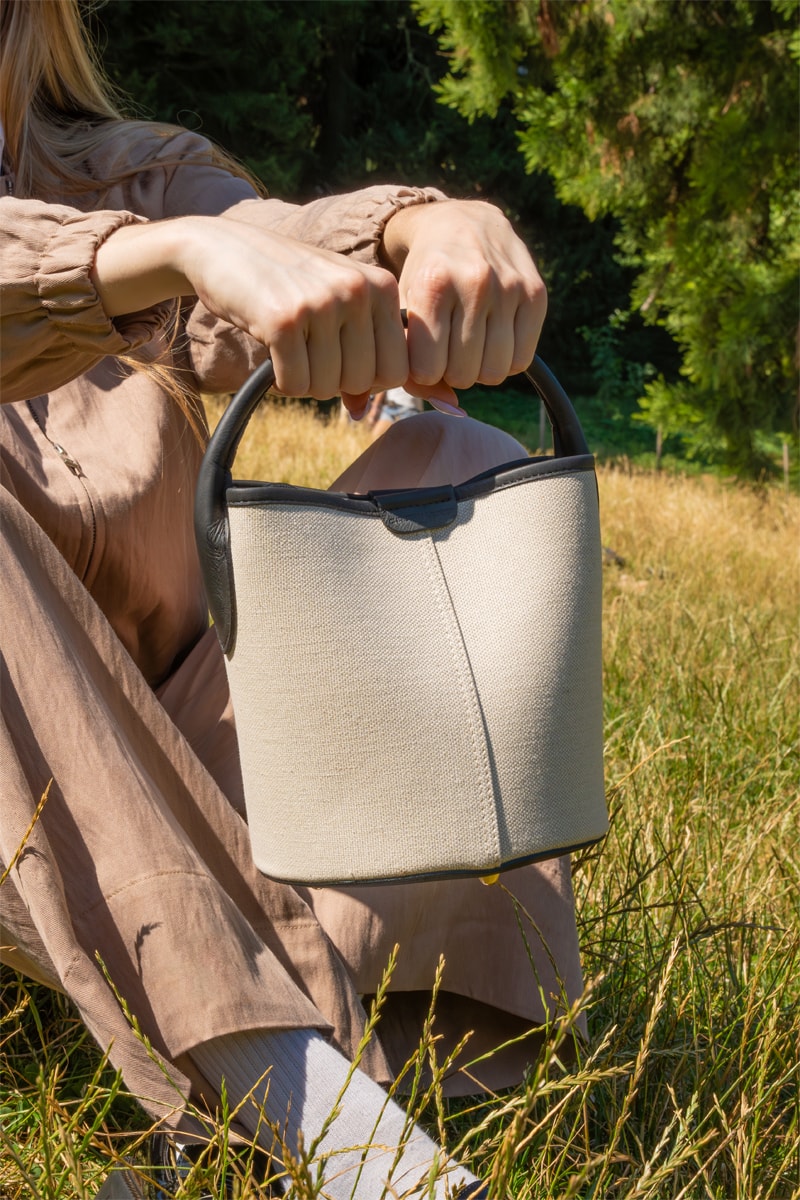 Details van leer aan het handvat, aan de schouderriem en aan de onderkant.