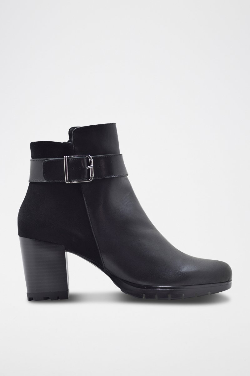 Ritssluiting aan de binnenkant en gespsluiting aan de buitenkant.
