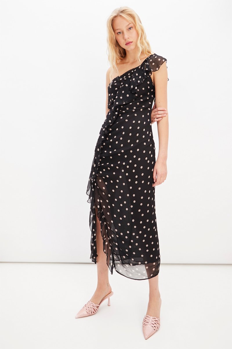 Asymmetrische jurk met ruches.