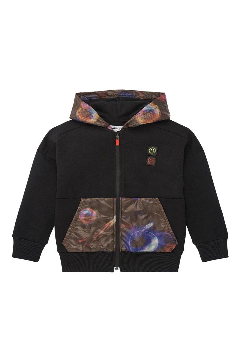 Decoratief motief op de capuchon en aan de voorkant.