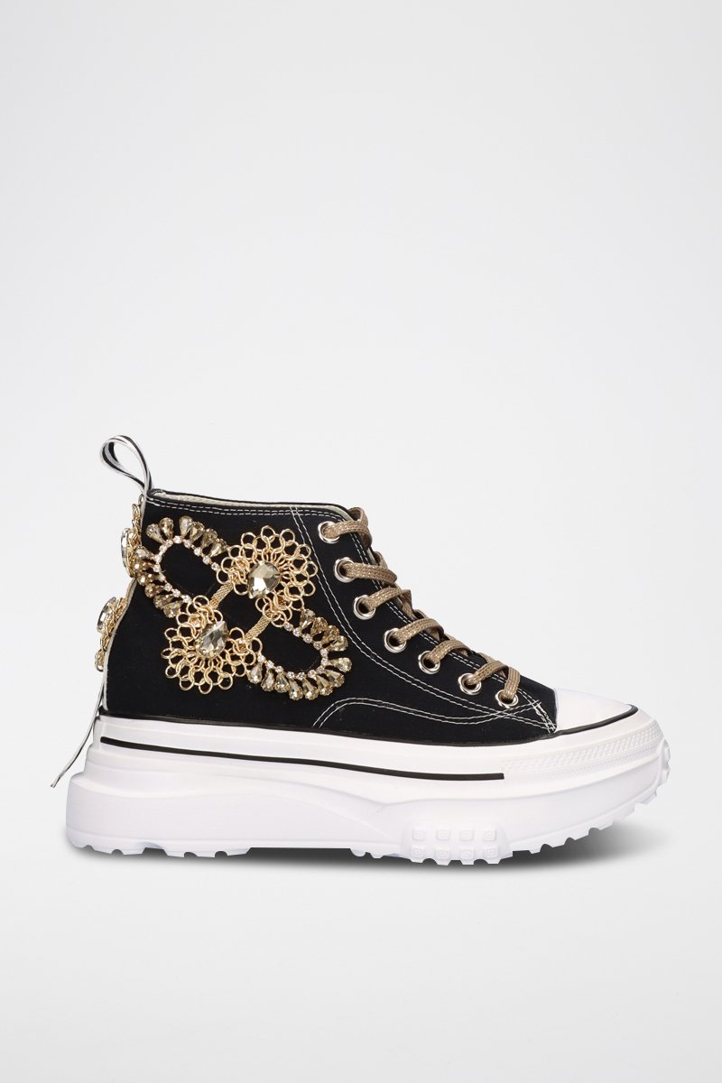 Metalen details, strass aan de zijkanten en aan de achterkant.