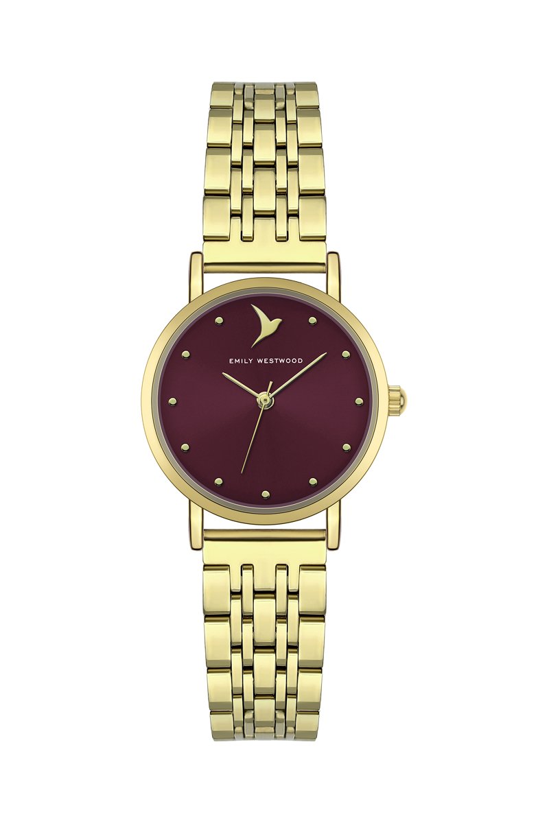 Stalen Quartz Horloge - Goudkleurig en Bordeauxrood - Emily Westwood