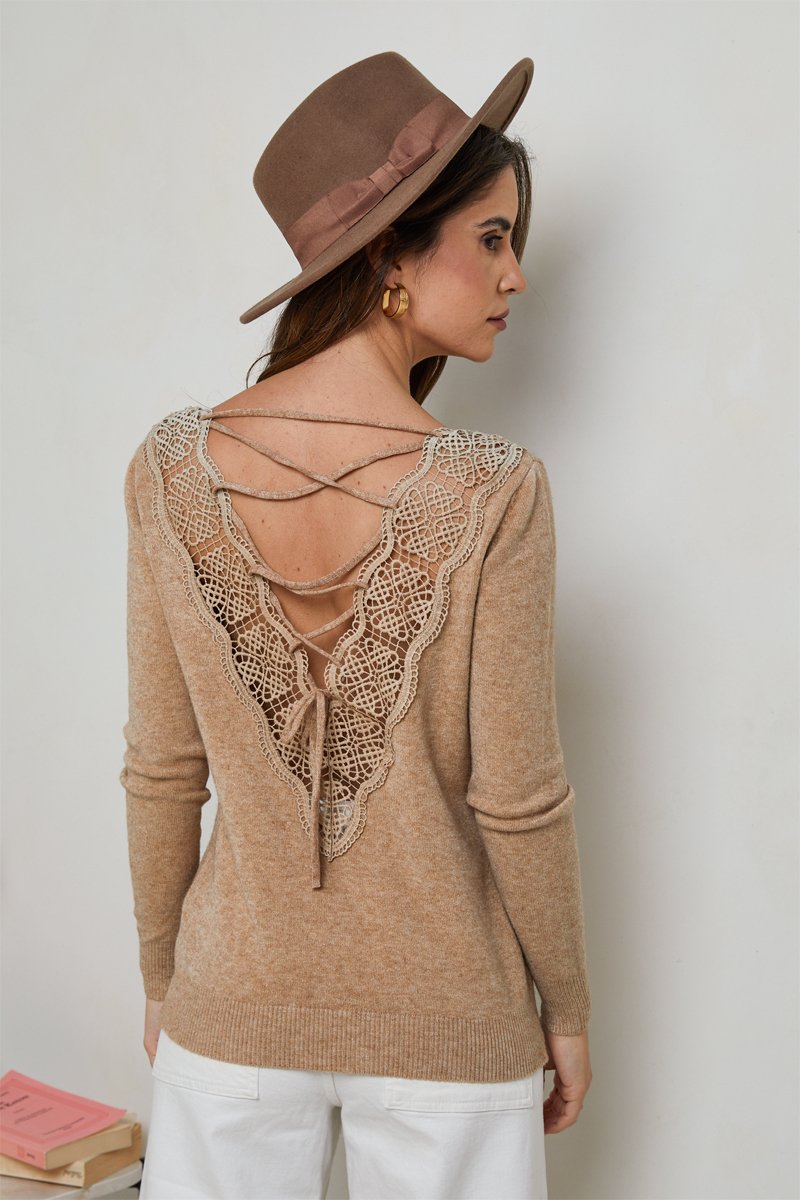 Decolleté. biezen en gekruiste strikkoorden aan de achterkant.