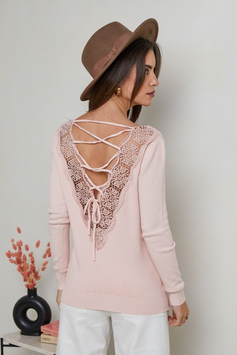 Decolleté. biezen en gekruiste strikkoorden aan de achterkant.