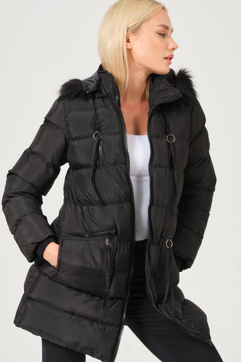 Gewatteerde jas met afneembare capuchon en imitatiebont.