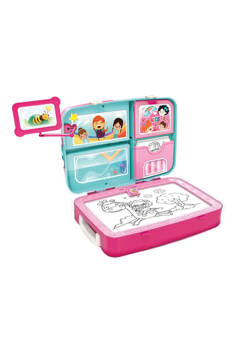 Tekenkoffer bevat: Magneten (26 letters, 10 cijfers en 7 wiskundesymbolen), 4 kleurplaten, 2 whiteboardmarkers met uitwisbare dop, 4 krijtjes, 1 spons, 2 verstelbare riempjes, enz.)