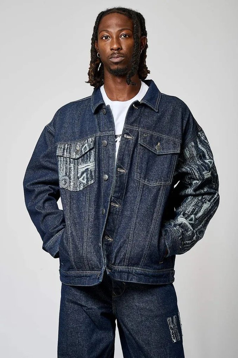 Contrasterende gerafelde details op de zak en op de mouwen.