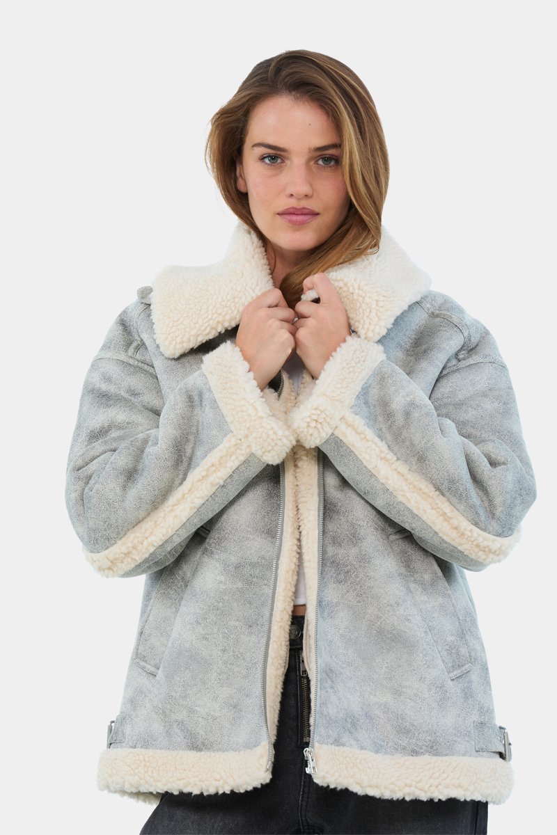 Imitatiebont bij de hals, op de mouwen en aan de onderkant.