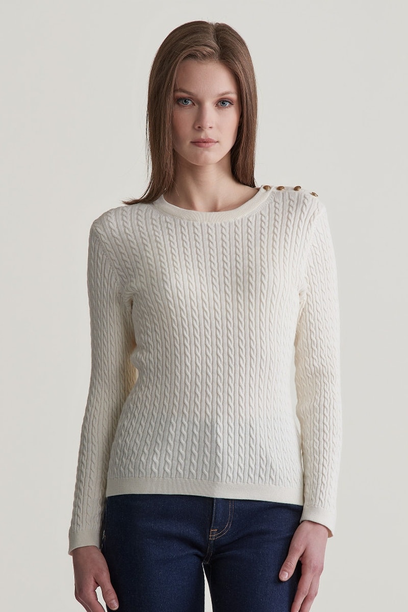 Ineengedraaid geweven trui.