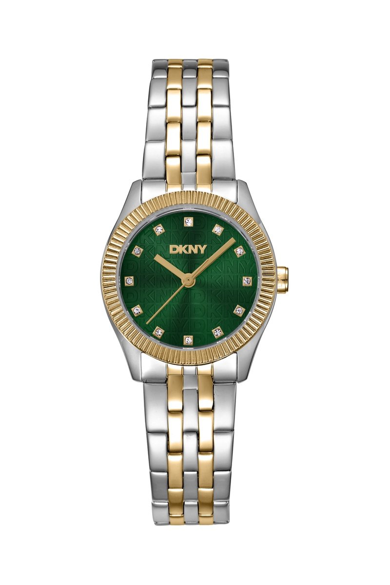 Wijzerplaat ingelegd met kristallen en logo in reliëf.