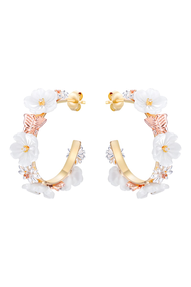Oorbellen van zilver, zilver doublé geelgoud en zilver doublé roségoud ingelegd met parelmoer en zirkonia's.