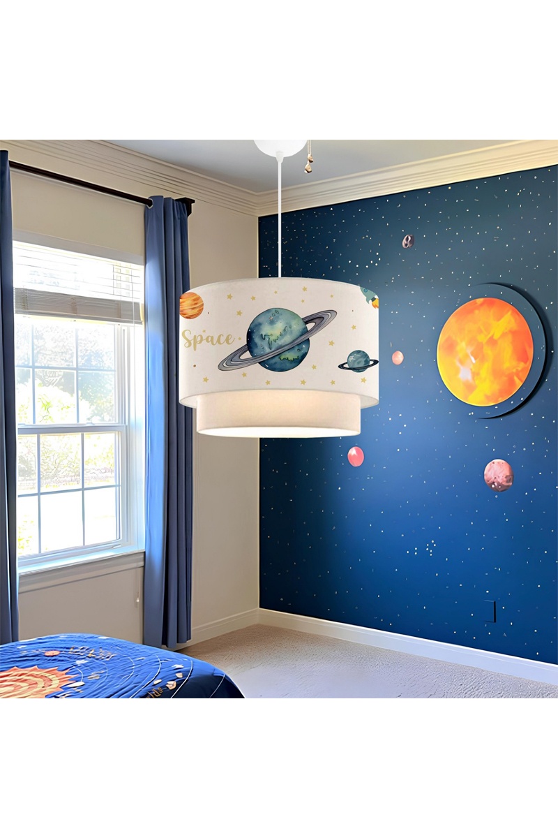 Lampkap met beletterig en ruimtemotief.
